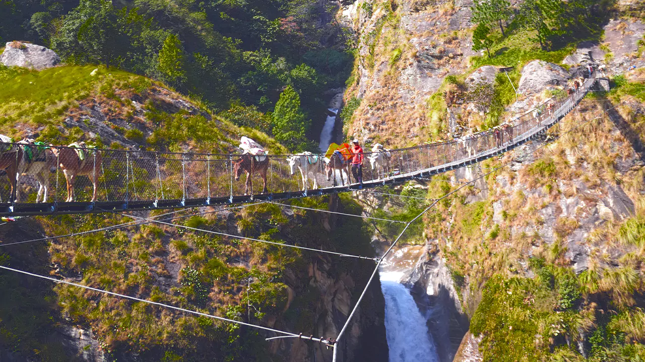 Mules crossing over one of many suspension bridges along the Manaslu Circuit Trek